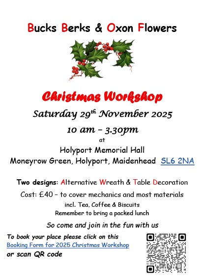 Join us in making an ‘Alternative Christmas Wreath’ and Table Decoration to take home all ready for the Christmas season. The workshop will be run by Carol Bennett on Saturday 29th November 2025, 10.00 – 3.30 at Holyport Memorial Hall, Moneyrow Green, Holyport, Maidenhead, SL6 2NA – Google Maps,
